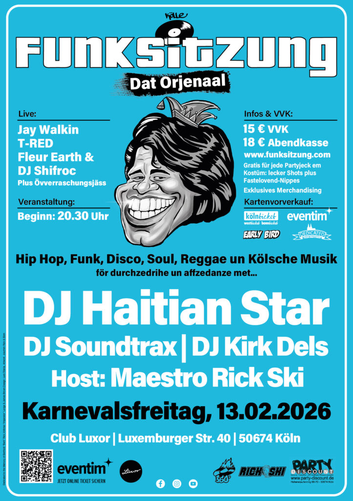 Mit DJ Haitian Star aka Torch (Headliner) sowie DJ Soundtrax und DJ Kirk Dels an den Decks, einem starken Live-Line-up und Überraschungsgästen ist die Richtung klar: Hier wird getanzt, gesungen und gefeiert – und zwar bis die Füße glühen. Und natürlich kommt das Kölsche nicht zu kurz: kölscher Rap, kölscher Reggae/Dancehall und kölsche Klassiker laufen in genau der richtigen Mixtur mit Funk & Hip Hop – das ist die einzigartige Funksitzung-Feieratmosphäre.